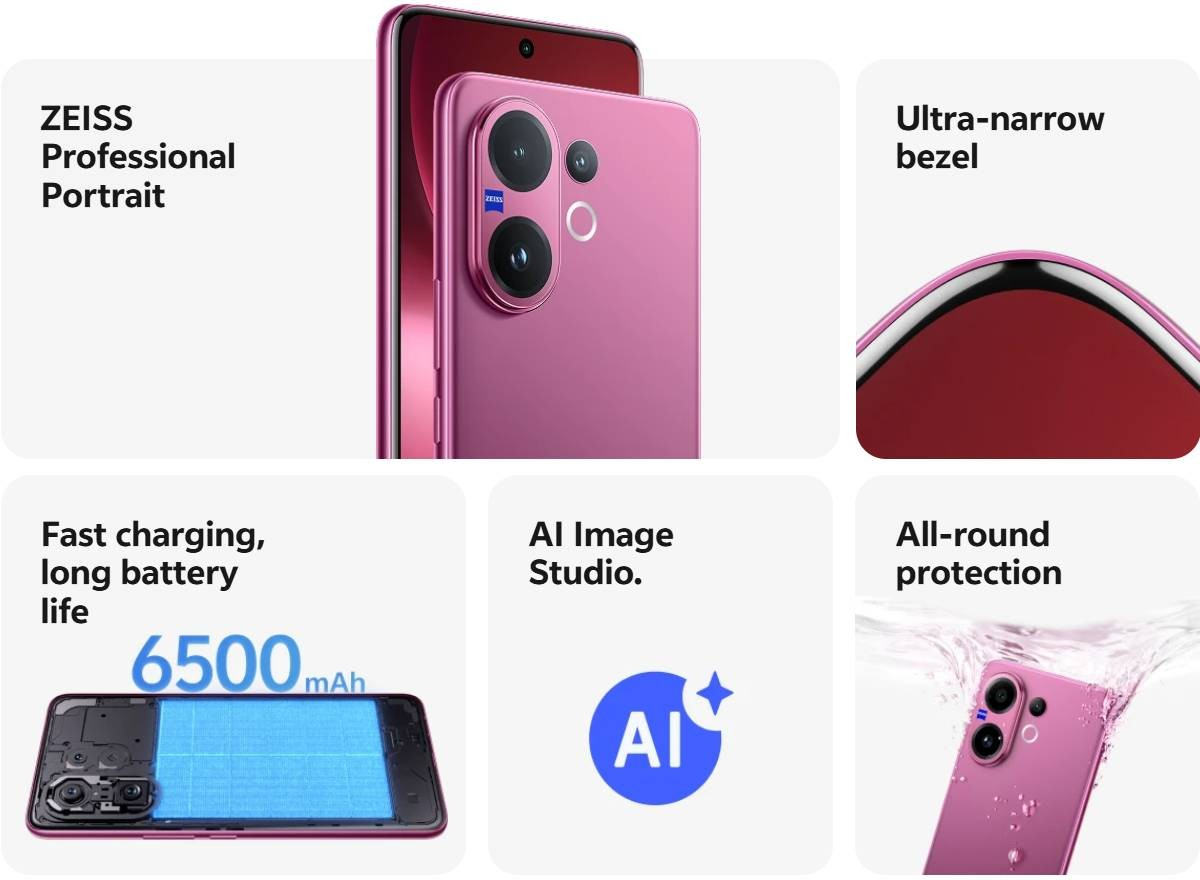 После релиза в Индии, vivo V60 появился в Малайзии, Тайване и Вьетнаме. Главный акцент в устройстве сделан на камере, в частности на 50-мегапиксельном телеобъективе с 3-кратным оптическим зумом, оптикой ZEISS и OIS. Его дополняют 50-Мп основной и 8-Мп сверхширокоугольный модули. Фронтальная камера тоже получила высокое разрешение (50 Мп).