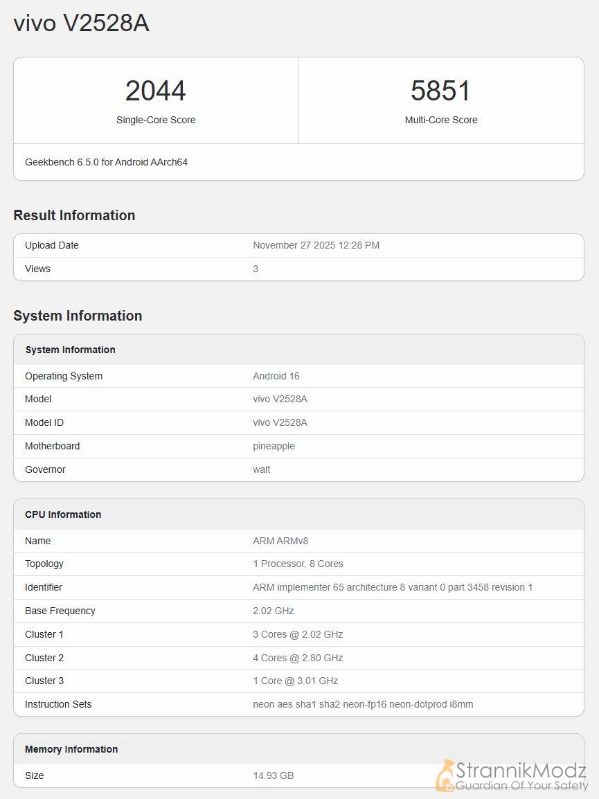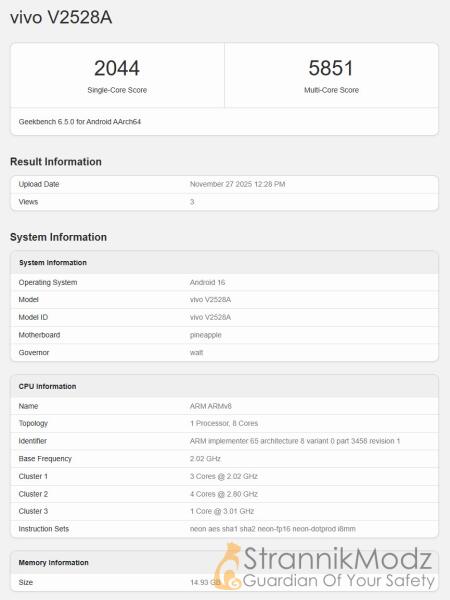 Модель Vivo S50 с номером V2582A ранее прошла сертификацию 3C, где для неё подтвердили поддержку быстрой зарядки мощностью 90 Вт. Теперь эта же модель появилась в Geekbench. Согласно данным теста, смартфон работает на платформе Snapdragon 8s Gen 3, оснащён 16 ГБ оперативной памяти и управляется Android 16. Устройство набрало 2044 балла в одноядерном и 5851 балл в многоядерном тестах.
