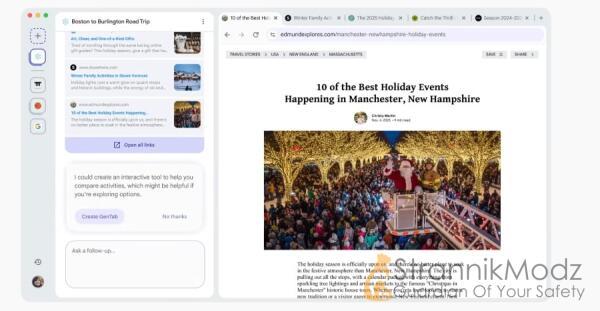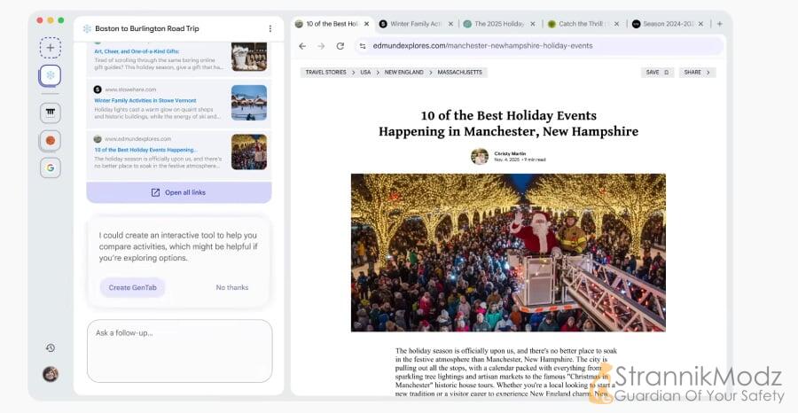 Интерфейс Disco также отличается от привычных браузеров: стартовая страница открывается не строкой ввода URL, а чатом, где ИИ предлагает сайты, анализирует запросы и со временем предлагает создать GenTab, если видит устойчивый интерес к теме.