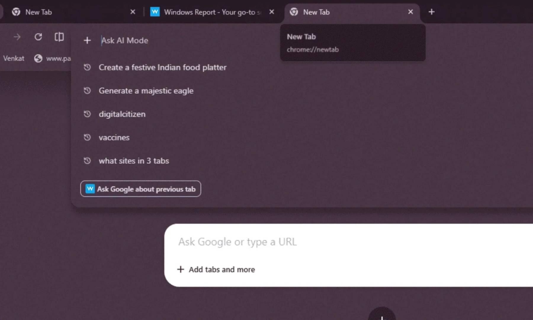 В десктопной версии при открытии AI Mode из адресной строки появилась опция «Спросить Google о предыдущей вкладке» (Ask Google about previous tab). Так можно задавать вопросы о контенте страницы, которую вы только что читали, без необходимости переключаться обратно.