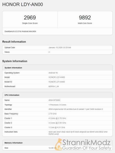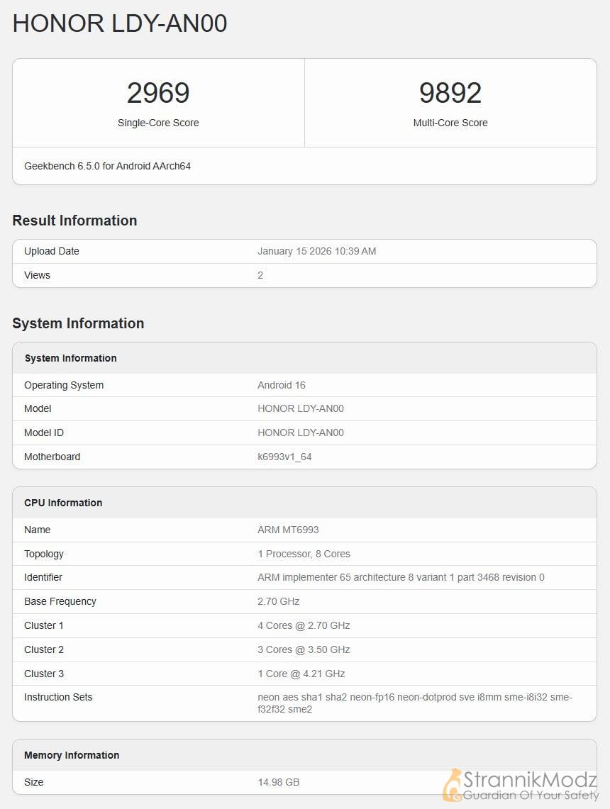 hulio3343 17-01-2026, 14:46 25 Новости порталаВ бенчмарке смартфон фигурирует под номером модели LDY-AN00. Согласно данным Geekbench, Honor Magic 8 Pro Air оснащён процессором MediaTek Dimensity 9500, работающим на полных частотах. Чип выполнен по восьмиядерной схеме с одним мощным ядром на 4,21 ГГц, тремя производительными ядрами с частотой 3,50 ГГц и четырьмя энергоэффективными ядрами на 2,70 ГГц. За графику отвечает ускоритель Mali-G1-Ultra-MC12.