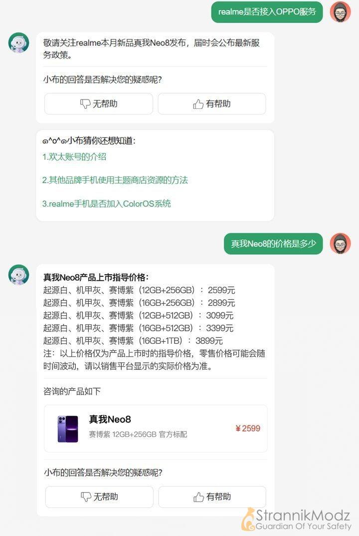 hulio3343 21-01-2026, 22:38 34 Новости порталаСогласно утечке, источник которой связывают с системой умной поддержки клиентов Oppo, Realme Neo 8 выйдет в четырёх версиях памяти: 12 ГБ ОЗУ + 256 ГБ, 12 ГБ + 512 ГБ, 16 ГБ + 512 ГБ и 16 ГБ + 1 ТБ. Их предполагаемые цены составляют $375, $457, $490 и $560 соответственно. Цветовые варианты в утечке не указаны, однако ожидается, что смартфон будет доступен в расцветках Origin White, Mecha Grey и Cyber Purple.