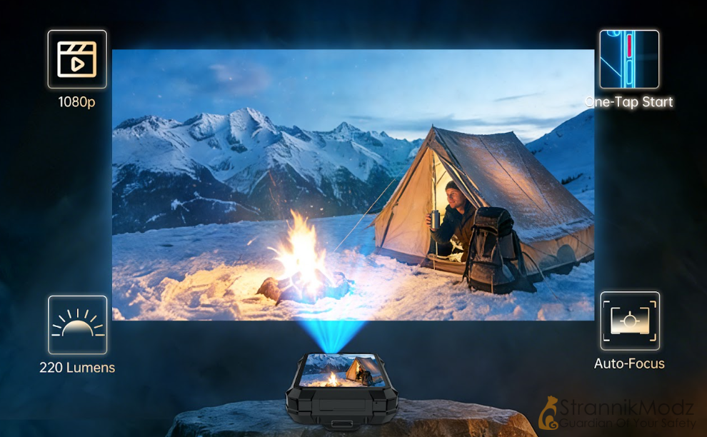 Ключевой особенностью TANK X стал встроенный DLP-проектор с разрешением до 1920×1080 пикселей и яркостью 220 люмен. Он поддерживает лазерную автофокусировку, автоматическую коррекцию трапеции до ±40° и запускается одной кнопкой. В зависимости от режима питания проектор способен работать до шести часов, что делает его пригодным для выездных презентаций, инструктажей и даже автономных развлечений в полевых условиях.