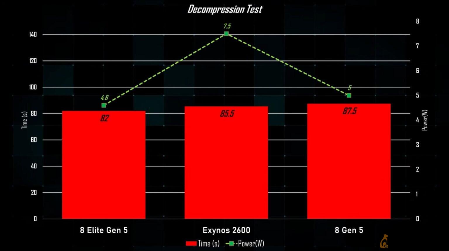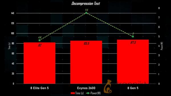 Проблемы проявились и в практических задачах, таких как распаковка 20-гигабайтного архива. Здесь Exynos 2600 снова оказался менее эффективным, достигая примерно 7,8 Вт потребления против менее чем 5 Вт у конкурентов. Кроме того, чип Snapdragon справился с задачей быстрее.