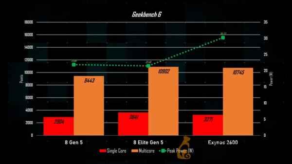 Сравнение производительности в Geekbench 6 также не даёт Exynos явного преимущества. Чип Samsung показывает 3271 балл в одноядерном тесте и 10 745 — в многоядерном, тогда как Snapdragon 8 Elite Gen 5 набирает 3641 и 10 902 балла соответственно. При этом более низкое энергопотребление делает решение Qualcomm заметно эффективнее.