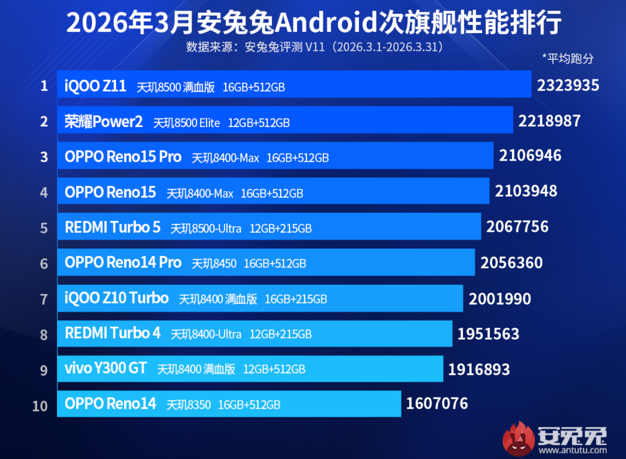 Победителем стал недавно представленный iQOO Z11. Смартфон работает на разогнанной версии процессора Dimensity 8500 и набирает в среднем 2 323 935 баллов. Создатели бенчмарка отмечают, что успех этого чипа кроется в архитектуре, состоящей исключительно из производительных ядер Cortex-A725 с повышенными частотами.